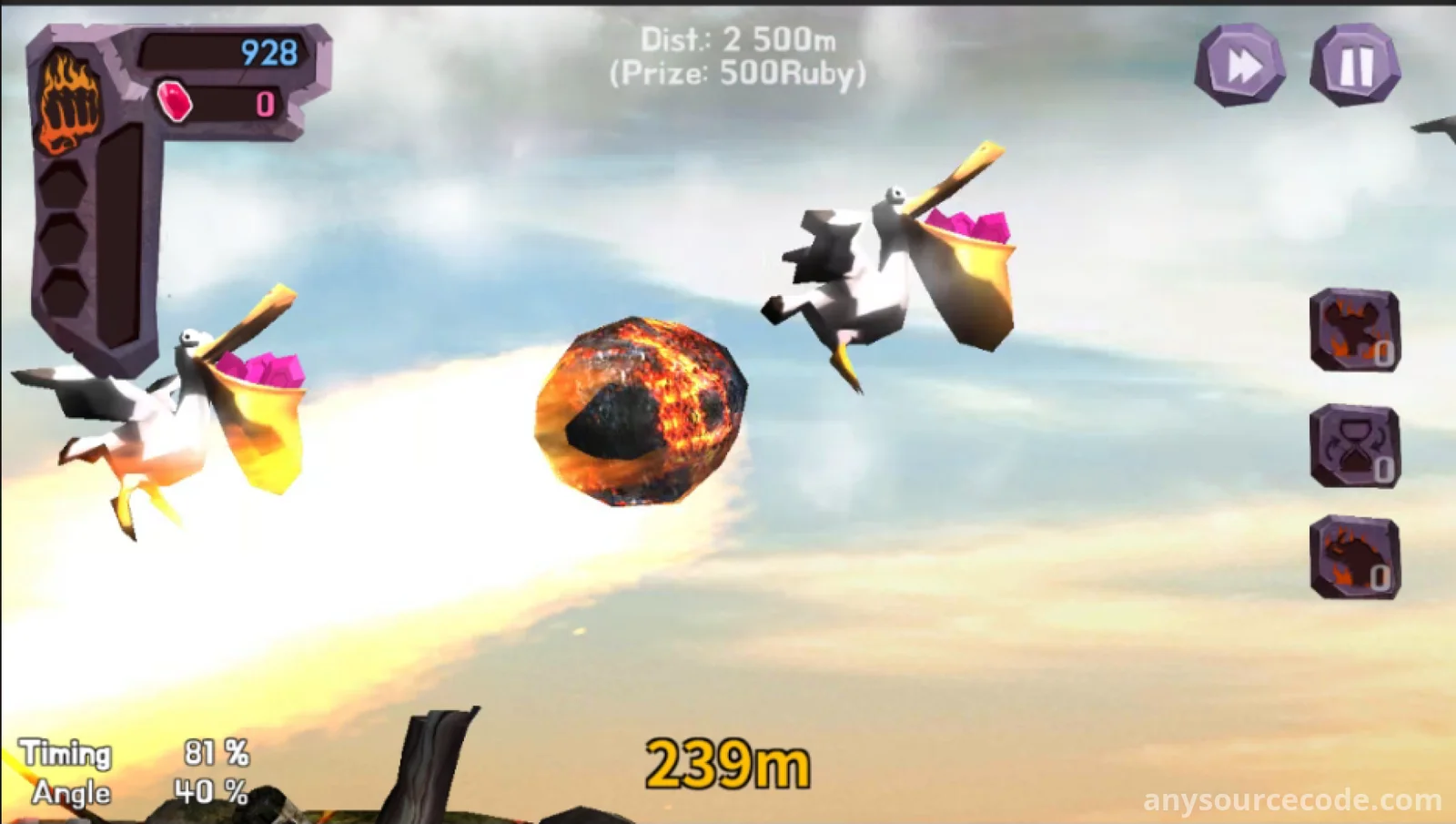 - Flying objects drop rubies when they hit pelicans, space turtles, or space stingrays