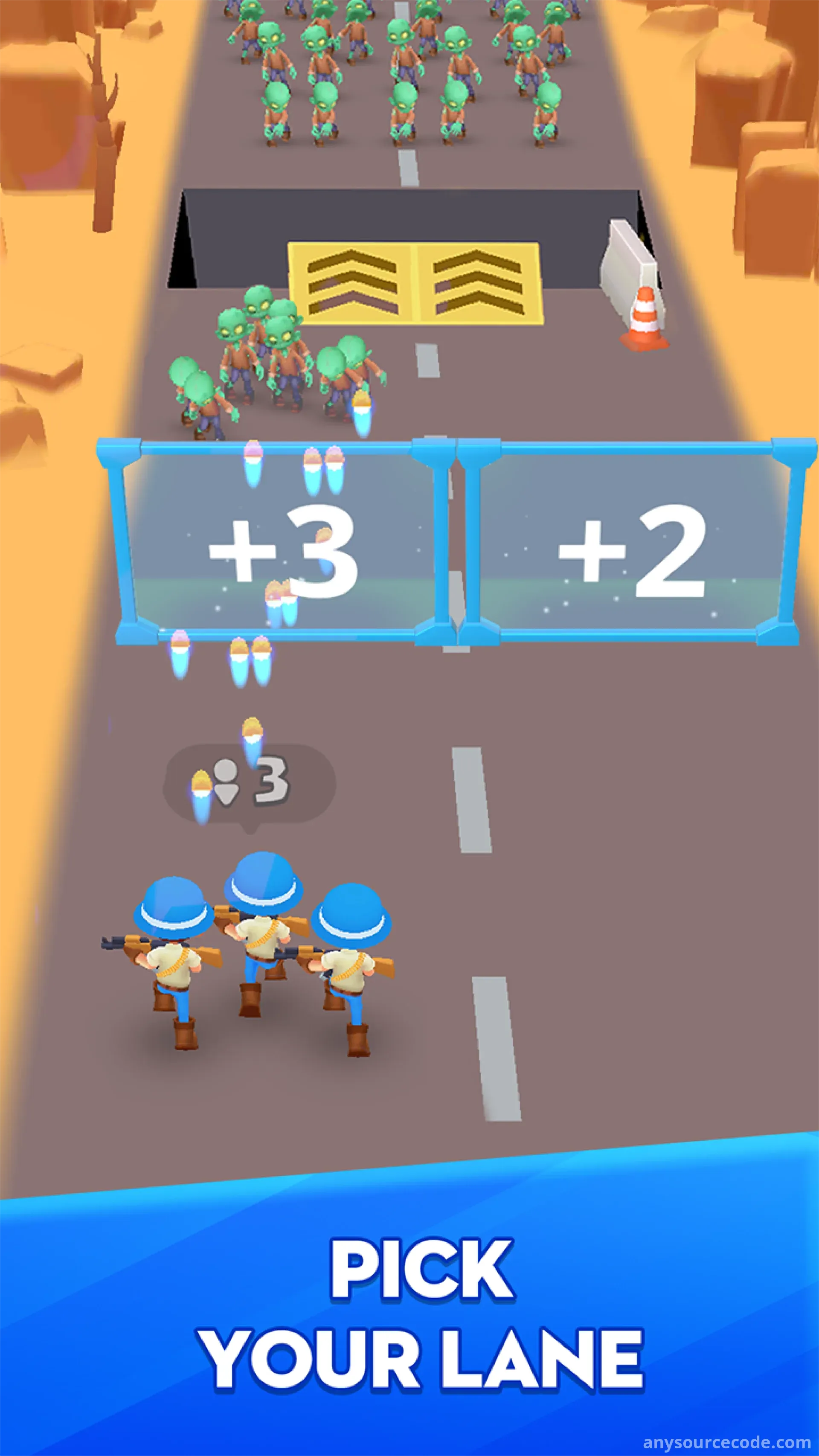 Army Run 3D: Crowd Battle is a thrilling strategy-action game where you lead a growing army through waves of zombies. Make smart choices, strengthen your forces, and fight your way through a post-apocalyptic battlefield. Choose wisely between two numbered boxes after each round to boost your army’s size or power. Each decision could be the difference between survival and defeat!