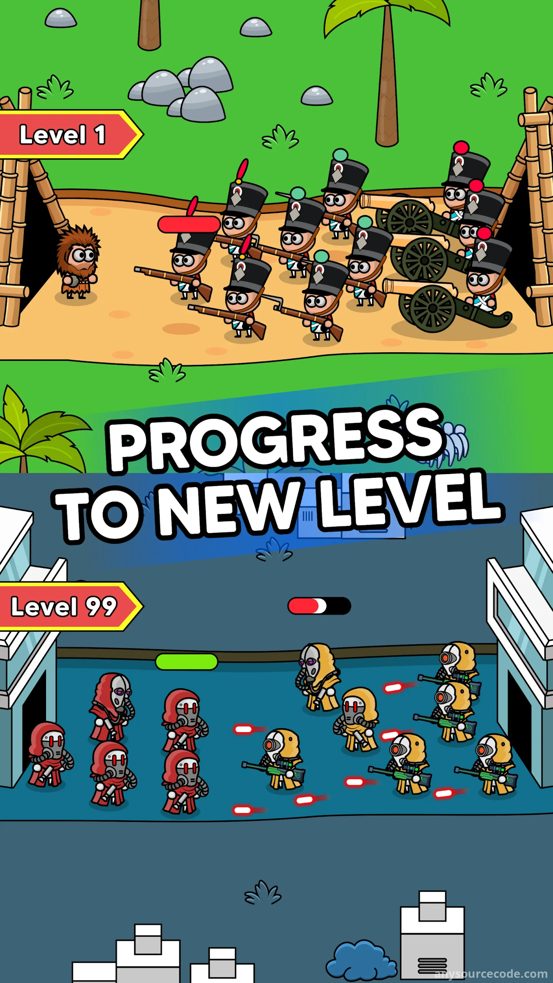 Command legendary warriors and lead resilient forces through history’s greatest conflicts. Begin with gladiators in the Colosseum, samurai, shoguns, knights, and archers, then advance into modern warfare with tanks, rockets, jets, and advanced military units. Finally, step into the future where only superior strategy and cutting-edge technology secure victory.