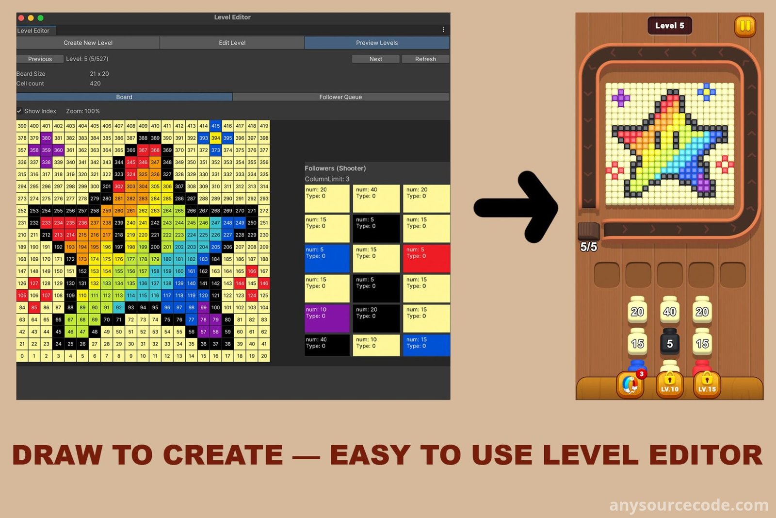 Color Cube Shooter is a smooth and satisfying puzzle game that combines classic block mechanics with shooter-style gameplay. Players place and shoot colored cubes onto a grid, matching colors and clearing space through strategic planning and timing. With over 500 handcrafted levels and a built-in level editor, this project is ideal for fast publishing, customization, or building a complete puzzle game with ease.