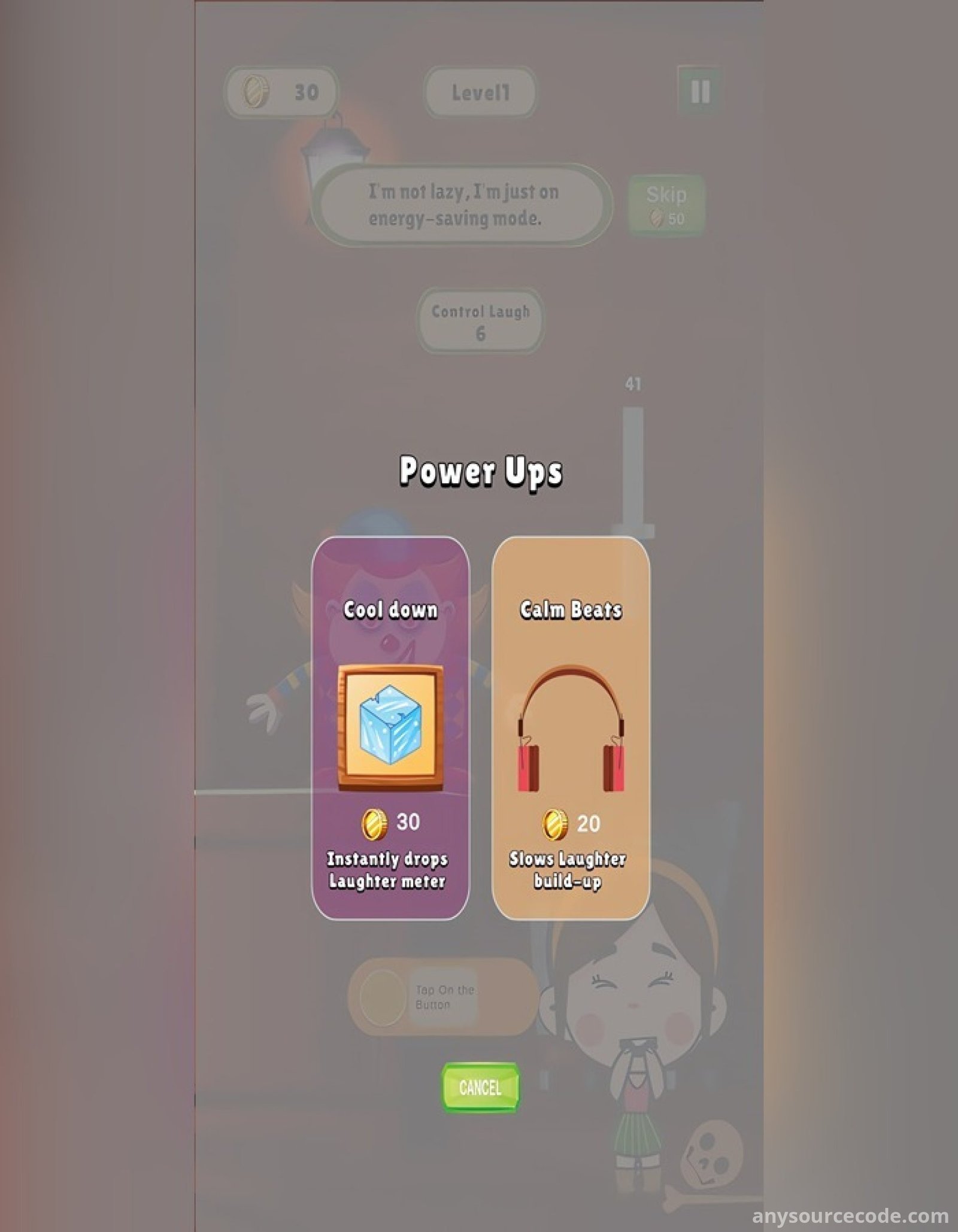 - Strategic power-ups including skip level, laugh cool down, and slow time