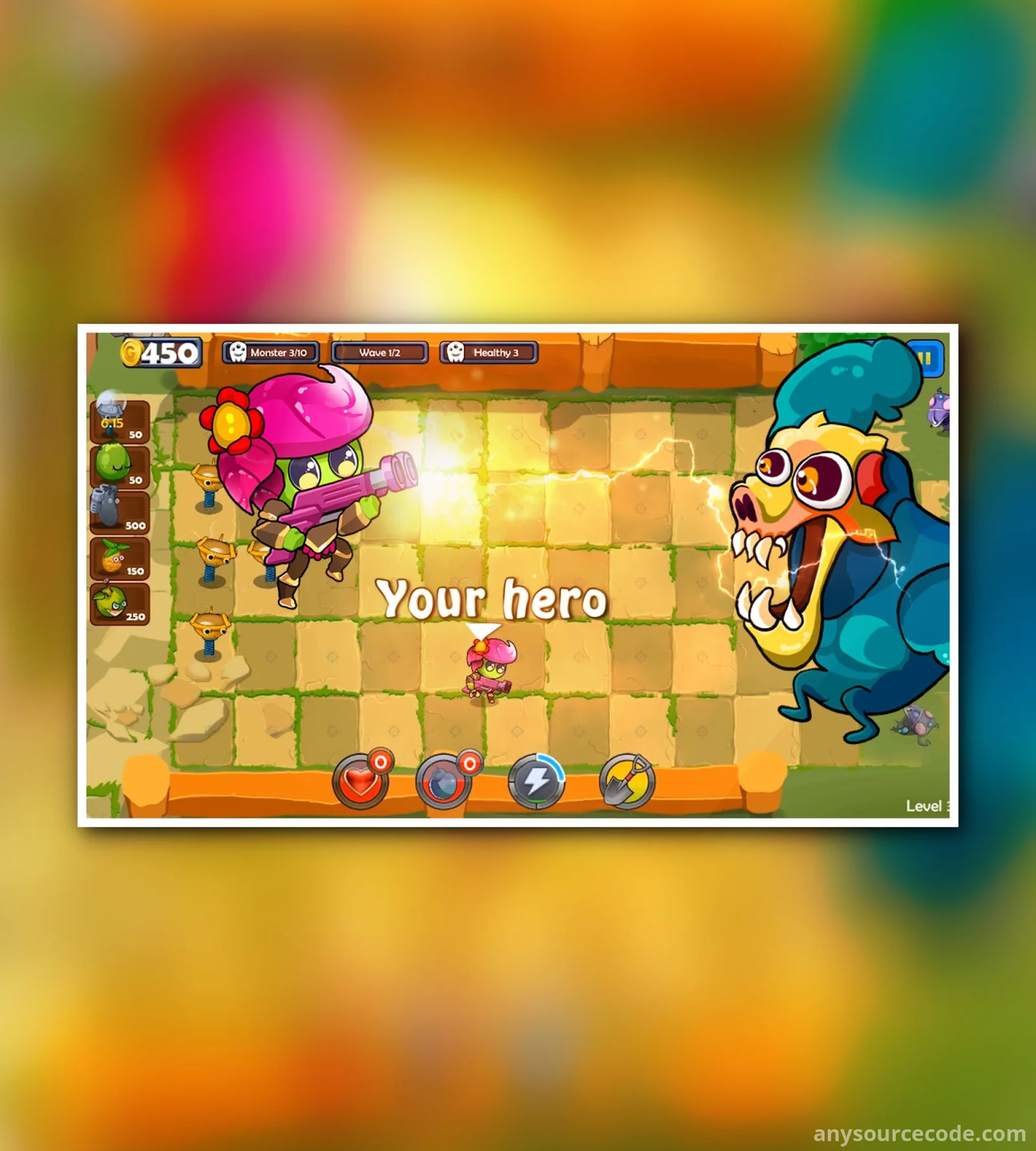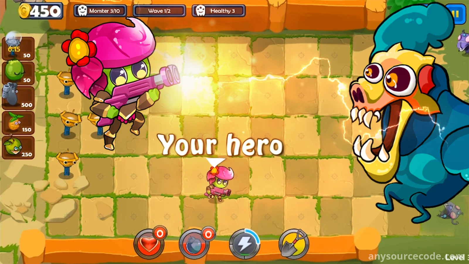Monsters have invaded the fruit world, turning innocent fruits into their food. The fruits must unite and defend their beautiful world from these dangerous enemies. Your mission is to destroy all monsters before they reach the garden.