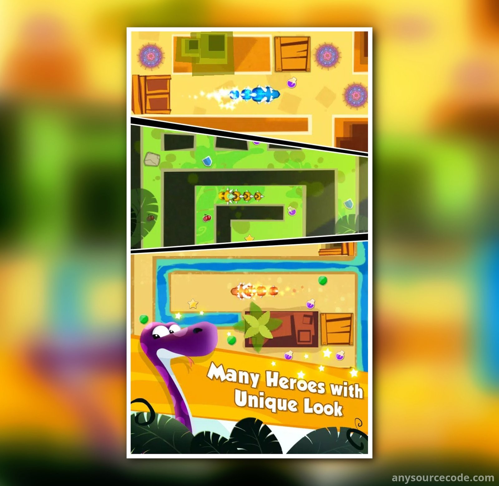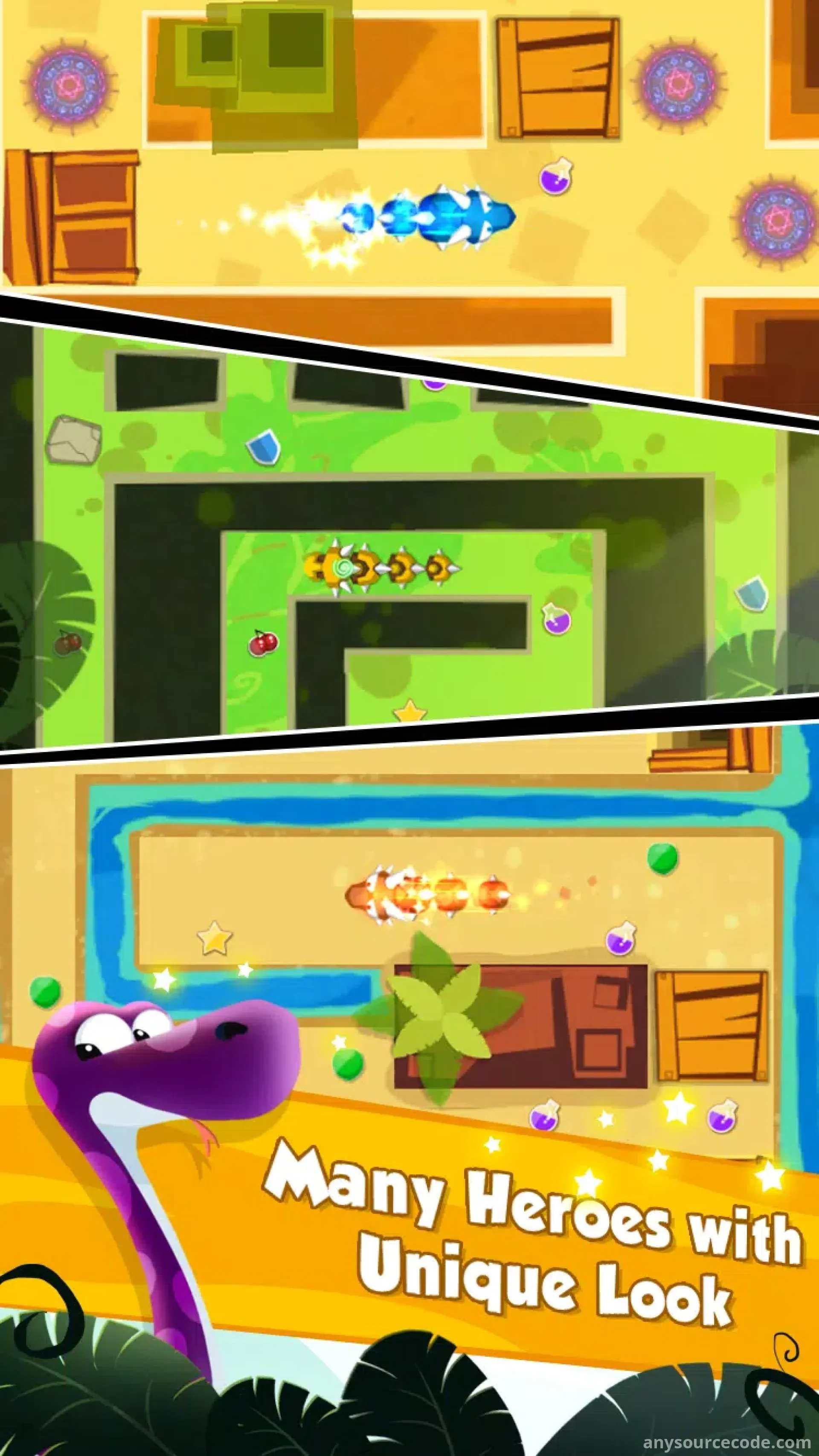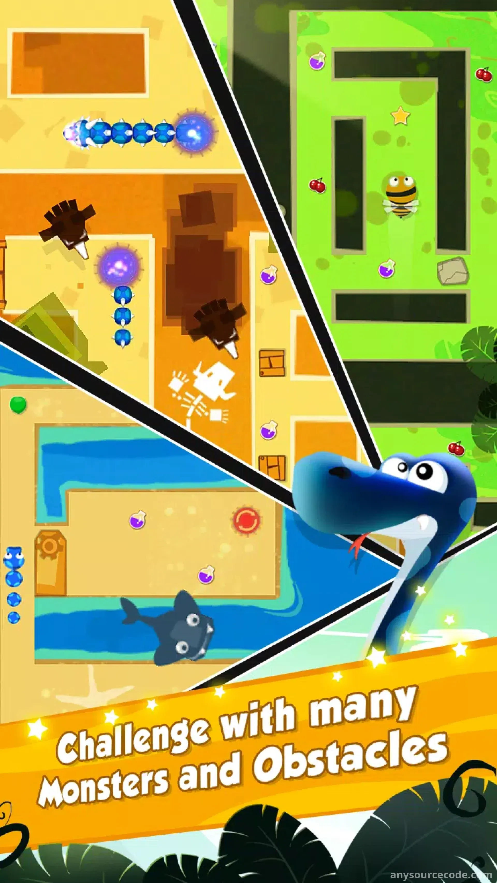 - Customizable assets: snakes, monsters, obstacles, levels, and more