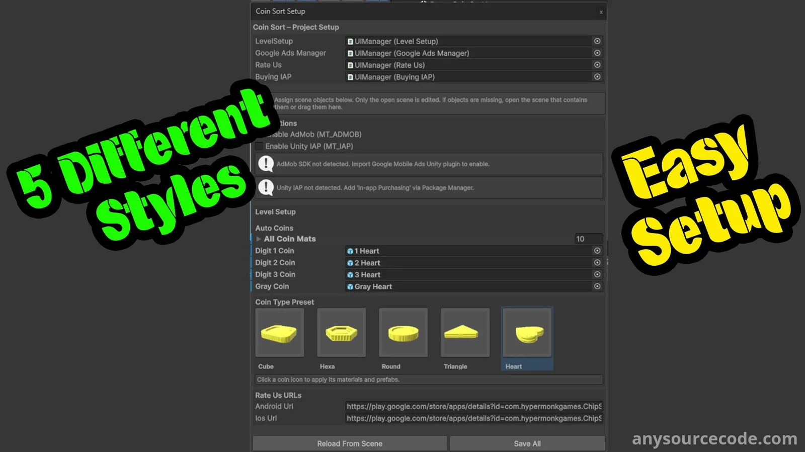 - Includes 5 sample coin themes, UI prefabs, and demo scenes