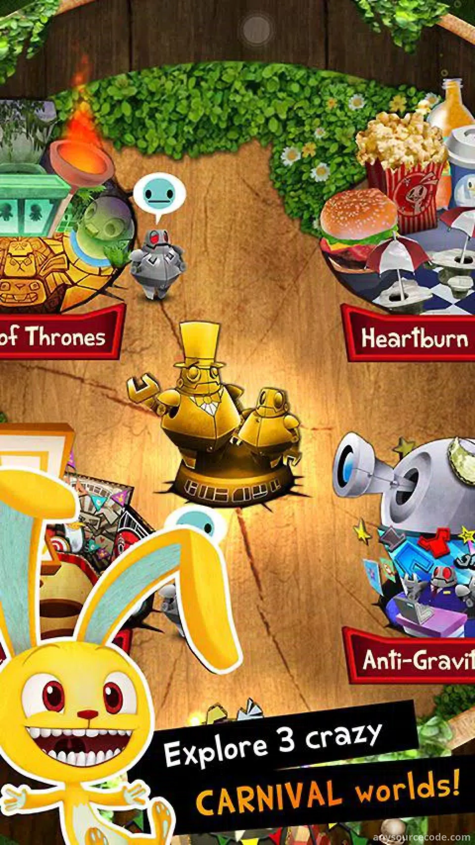 - Worlds include Crazy Carnival, Heartburn Alley, and Temple of Thrones